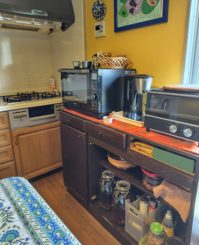 電子レンジやコーヒーメーカーを置いている棚もずっと前に扉が壊れて、そこに布を貼っていました。この棚は、本来テーブルと一体化していてキッチンカウンターになるというもの。結婚して数年後に新しい賃貸マンションに引っ越すときに買いました。