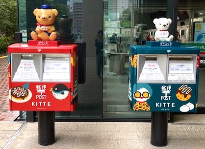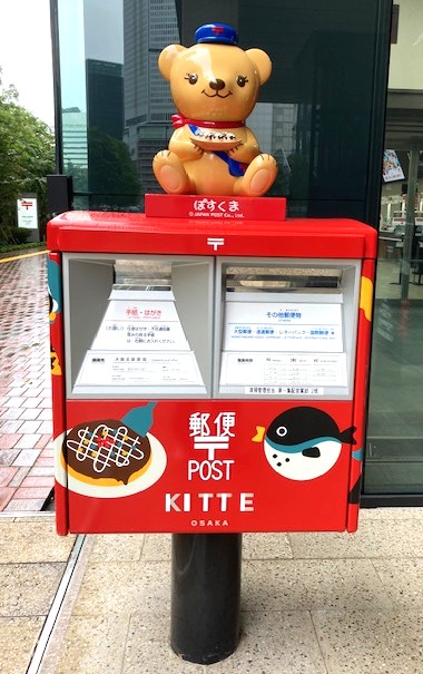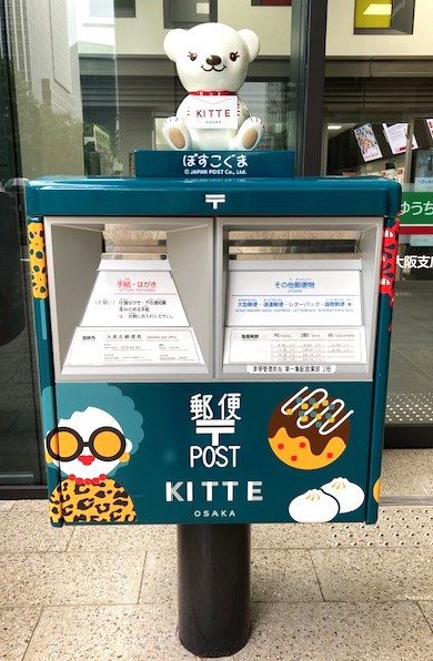 大阪の中央郵便局を訪れるのはほぼ20年ぶりだったので、KITTEのビルに入っているピカピカの中央郵便局にビックリ。入口では「ぽすくま」の大阪らしいデザインの可愛い2色のポストが出迎えてくれました。