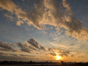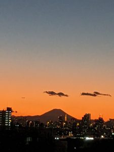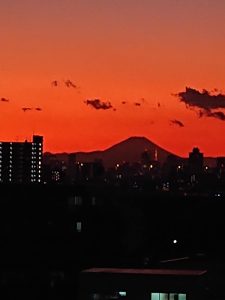 みんなは、「なに?どうした?」「こんなところでサボってた!」と姦しく階段を上がってきたが、西に広がる、東京とは思えない、遮るもののない広くて真っ赤な空、沈みゆく太陽、そそり立つ富士山を見ると一瞬にして静かになった。われわれは東京とは思えない(二度言った)空を堪能しながら、「なんか…すごいね」「空、広いなあ」「こんなに真っ赤になるんだー」「わたし、一生この光景を忘れないかも」と口々に言い合い、涙さえ流した。ドラマのワンシーンのようだった。